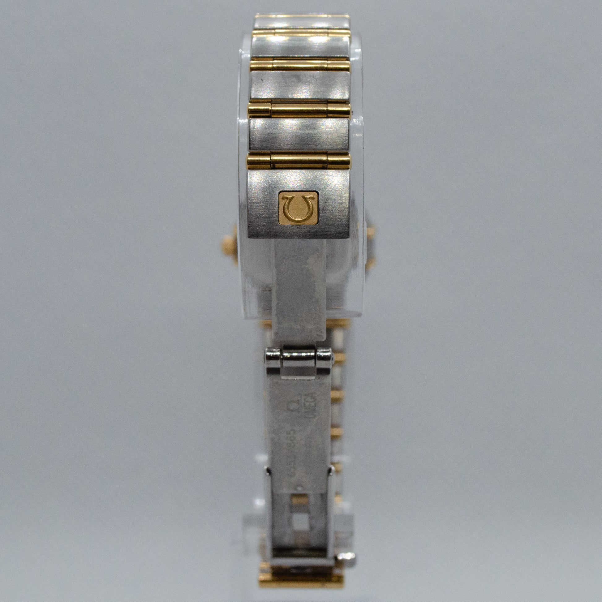This beautiful Omega Constellation is the 26mm Ladies size, and comes in two-tone with 18k yellow gold and stainless steel. The dial is mother of pearl with diamond indices, which plays beautifully with the diamond set bezel.